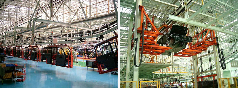 The new assembly workshop of Changfeng Automobile Company's Yongzhou base is newly built to meet the ever-expanding output. The annual output is 50,000 units, which are divided into chassis lines, interior lines, door lines and lifts and followers for up and down rotation. The undercarriage assembly conveyor system is composed of YTJ6 model conveyor. It consists of a fast chain and a slow chain. The process speed is 1-2.5m/min, the chain length is about 780m, the car accumulation length is 5300mm, and the station spacing is 6128mm. The car group adopts 6-car type and 27 sets of cars. The interior line adopts the YTJ6 model conveyor, which consists of a fast chain and a slow chain. The process speed is 1-2.5m/min, the chain length is about 500 meters, the car accumulation length is 5300mm, the station spacing is 6128mm, and the trolley group adopts 6 car type, 24 sets of cars. The door line adopts YTJ4 type conveyor. It consists of two fast chains and one slow chain. The process speed is 1-2.5m/min, the chain length is about 1200m, the car accumulation length is 3500mm, the station spacing is 4300mm, and the trolley group adopts 3 car type, 85 sets of cars.
