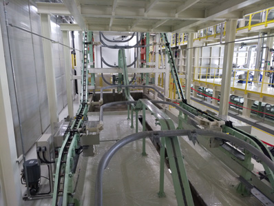 2、 浸槽垂直爬坡角度大(45°),入槽速度快,排氣好。縮短了前處理和電泳設(shè)備的長度。降低了前處理設(shè)備成本。