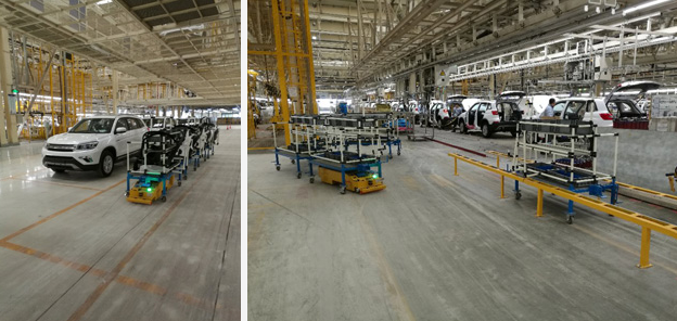 北京長(zhǎng)安汽車公司屬于重慶長(zhǎng)安汽車股份有限公司,主要生產(chǎn)中高端SUV車型,該AGV項(xiàng)目用于總裝車間底盤線、終裝線物流配送。配送方式采用SPS供給模式,將物料按正確的數(shù)量在準(zhǔn)確的時(shí)刻運(yùn)送到正確的地點(diǎn),實(shí)現(xiàn)無(wú)人化配送,滿足生產(chǎn)線60JPH節(jié)拍。AGV采用磁道航導(dǎo)引系統(tǒng),并通過(guò)控制系統(tǒng)與其他管理系統(tǒng)即時(shí)通訊,可實(shí)現(xiàn)無(wú)人自動(dòng)化運(yùn)輸,是汽車行業(yè)等提升行業(yè)競(jìng)爭(zhēng)力、減少人工成本、提高倉(cāng)配效率的選擇。
